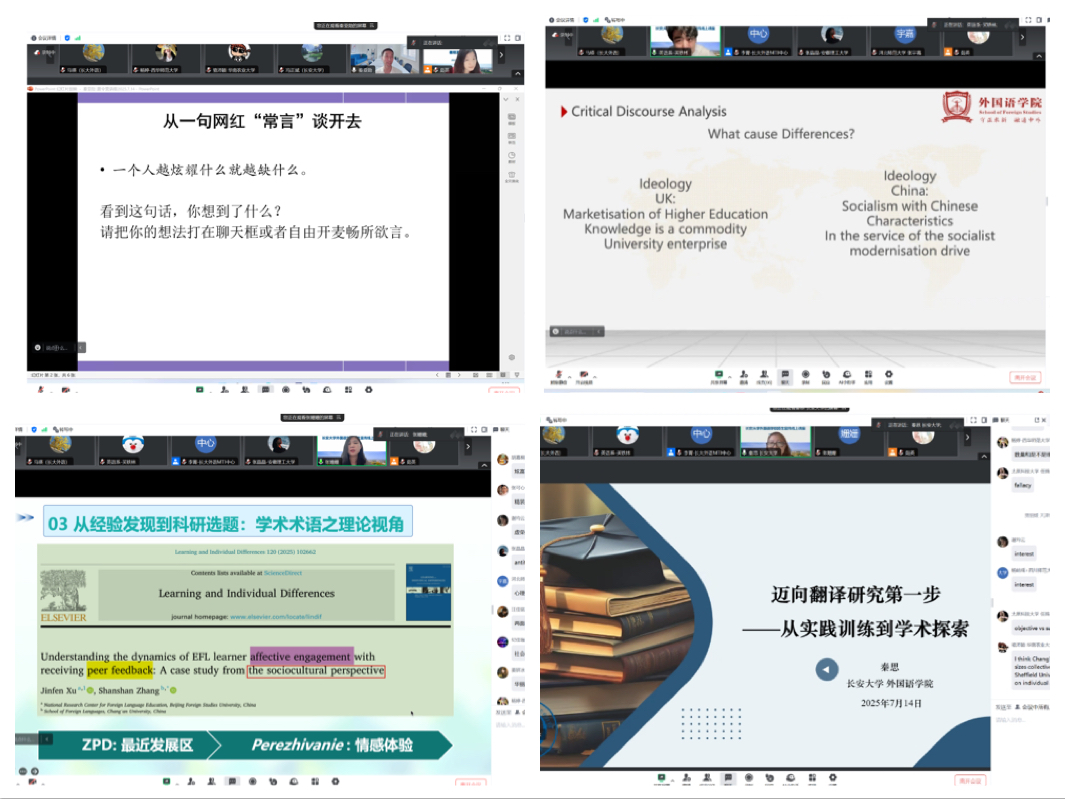在学术展示环节,学院多位骨干教师带来了前沿而实用的主题分享。秦亚勋副教授以“极高明而道‘修辞’”为题,引领大家领略语言艺术的深度与魅力,展现了修辞研究的智慧。买轶林博士围绕“How to Choose Your Research Field in Future Research?”,生动幽默地为有志于学术探索的学子提供了选择研究方向的专业指导。张姗姗副教授结合自身科研经历,以“外语教育中的学术发现:以同伴反馈中的情感投入为例”为题,生动细致地展示了如何从教学实践中发现研究价值。秦思副教授则以“迈向翻译研究第一步:从实践训练到学术探索”为题,通过具体案例,为对翻译研究感兴趣的学子指明了入门路径。这些讲座内容深入浅出,充分展示了学院教师的学术风采和各研究方向的特色。