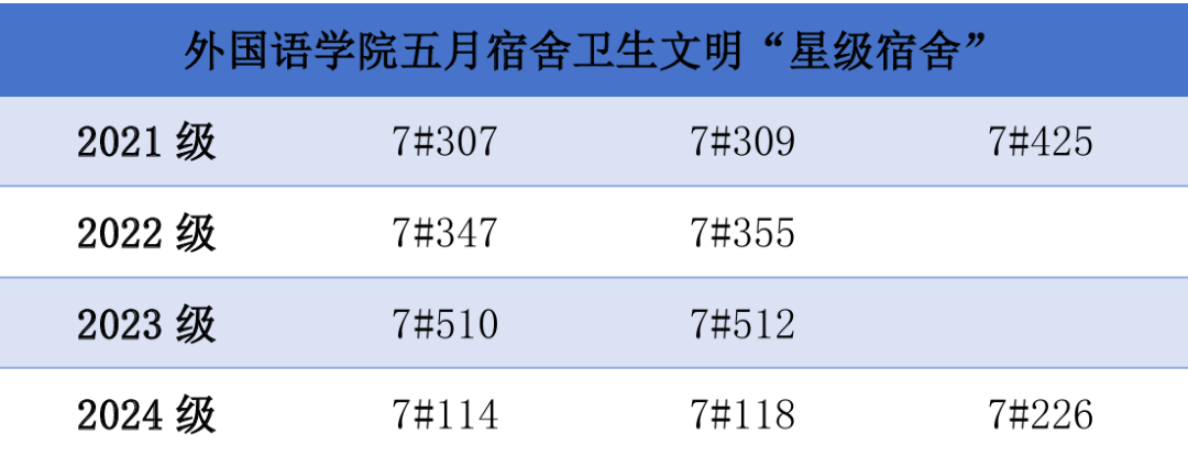 2025年5月12日至15日,tyc7111cc太阳成集团学生会权益服务部对本科生宿舍进行了卫生文明大评比,现将“星级宿舍”公示如下: