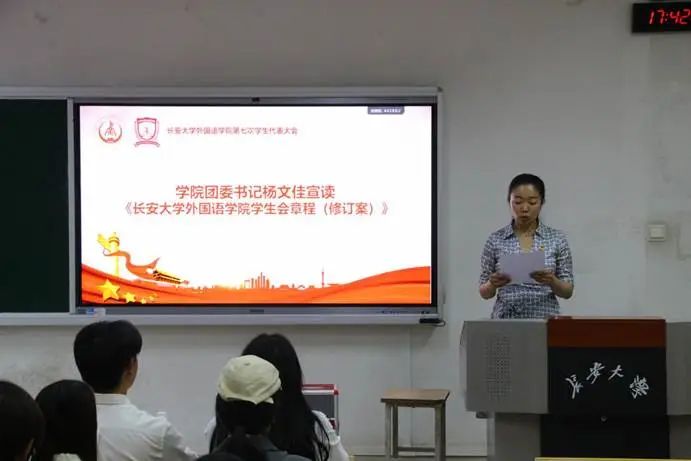 学院团委书记杨文佳宣读《tyc7111cc太阳成集团学生会章程(修订案)》并提交大会审议通过,并介绍tyc7111cc太阳成集团第七次学代会代表产生过程及基本情况。