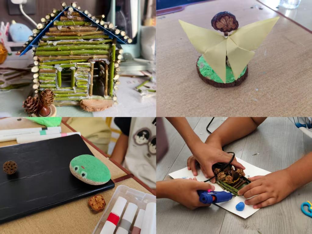 7月21日,“草木生艺”自然手工课的开展,让学生们利用自然材料发挥创意,培养了动手能力与审美情趣。枫叶拼贴的蝴蝶栩栩如生,树枝搭建的小屋错落有致,石子彩绘的动物憨态可掬……相关作品在学院公众号发起投票活动,参与人次超过200位,受到广泛关注,进一步扩大了支教活动的影响力。