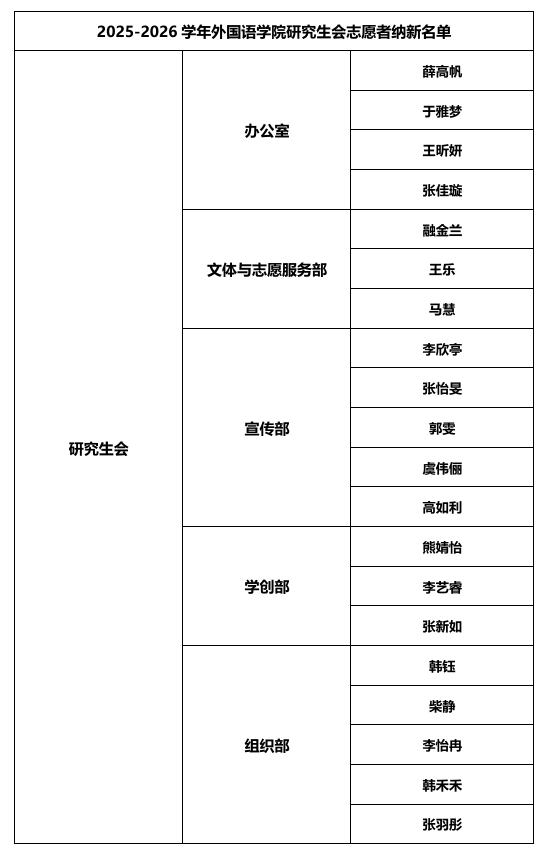 9月23日,学院在223报告厅举行了2025-2026学年研究生会纳新面试。经公开答辩与综合评议,拟录用名单现已确定,予以公示: