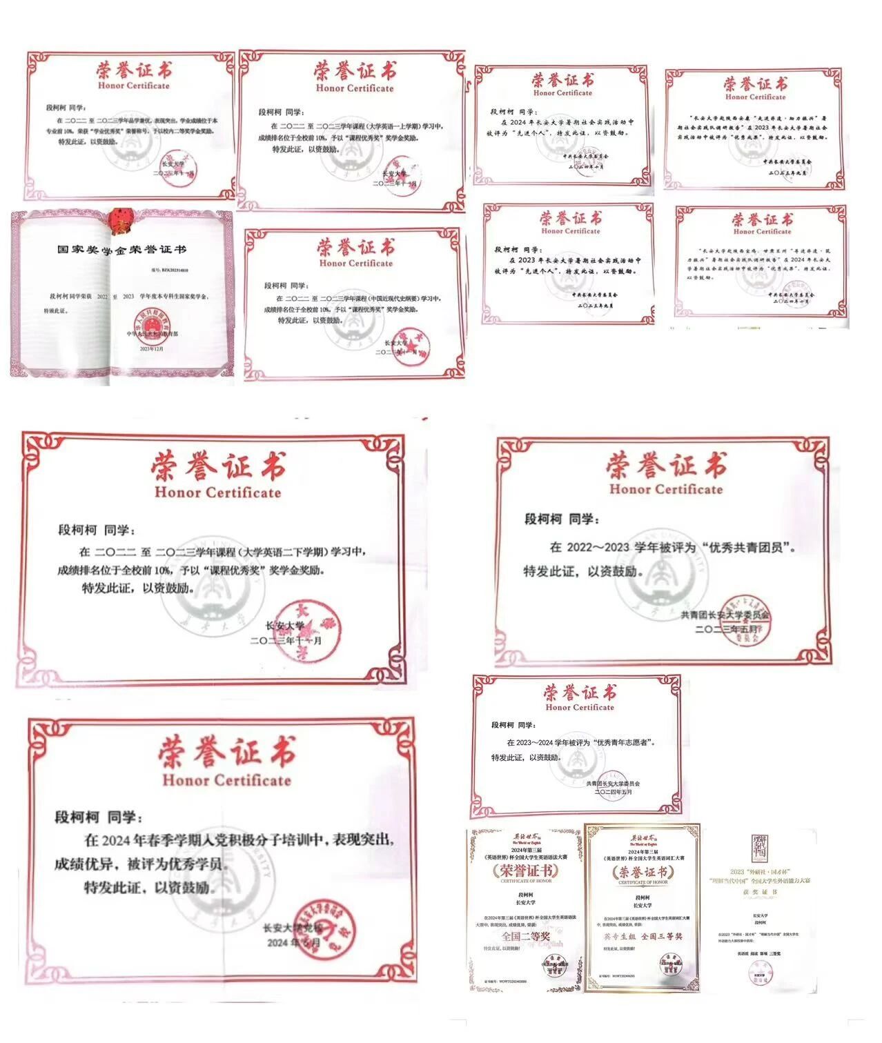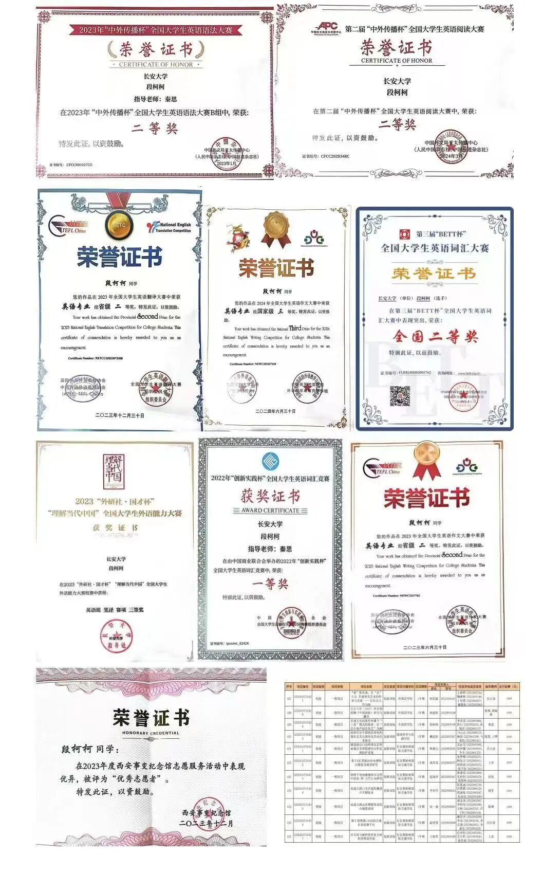 自与英语以 26 个字母结缘,段柯柯便坚定地踏上了英语学习之路。在大学的学习殿堂里,她以热爱为舟,勤奋为桨,在知识的海洋中破浪前行。本科期间,她全情投入专业课程学习,在《综合英语》《西方文明史》《英语视听说》等课程中屡获高分,展现出扎实的专业基础。她深知,英语学习不止于课堂,更在于实践与挑战。于是,她踊跃参加各类英语学科竞赛,凭借深厚的语言功底和出色的应变能力,荣获全国大学生英语作文大赛国家三等奖、全国大学生英语翻译大赛省级二等奖等 10 余项荣誉,在竞赛中不断锤炼自己,提升专业素养。