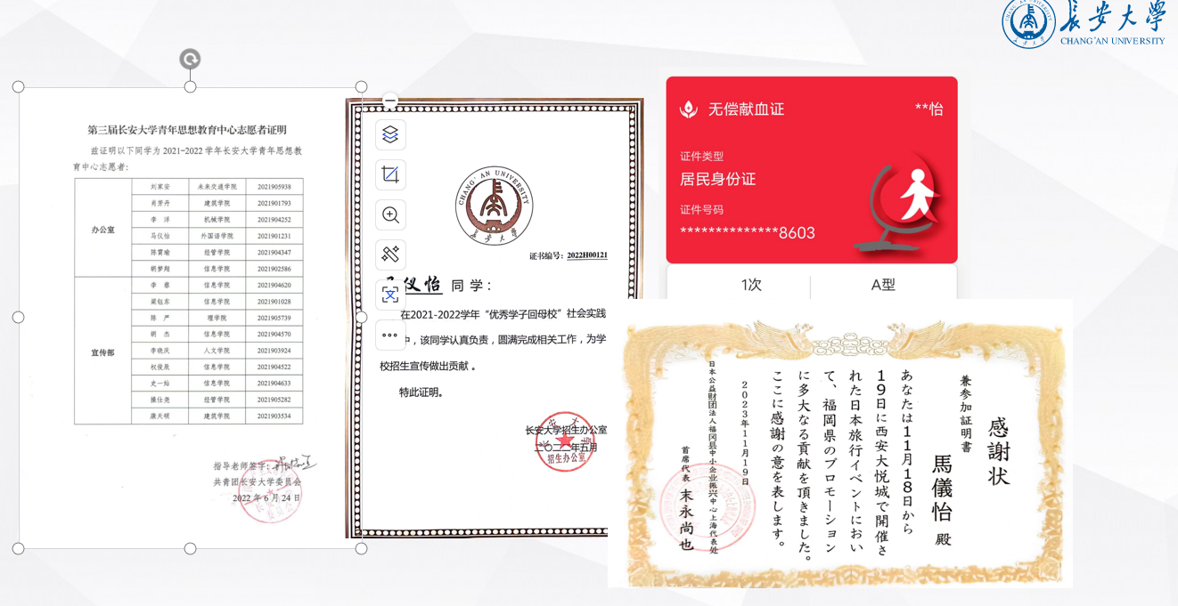大一时,她担任太阳成tyc7111cc青年思想教育中心干事,积极参与菁英力练营等活动。她还加入了太阳成tyc7111cc希望阵营社团,踊跃参加献血等志愿活动。在假期,她也主动投身社会实践,参与了“优秀学子回母校”活动。疫情期间,她担任疫情防控志愿者,负责组织全员核酸检测、登记疫苗接种信息以及防疫宣传等工作。大三上学期,她还担任了“日本,精彩无限”福冈中小企业振兴中心上海代表处的志愿者,负责日常翻译和宣传福冈旅游信息。