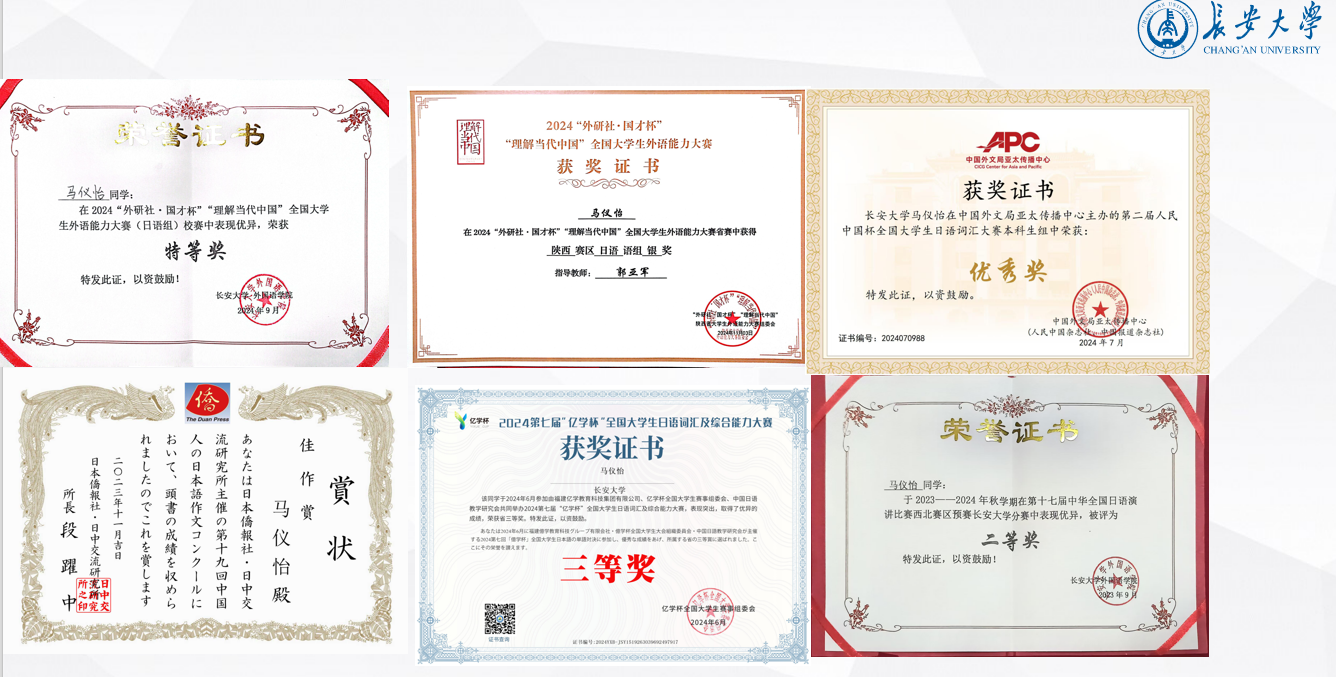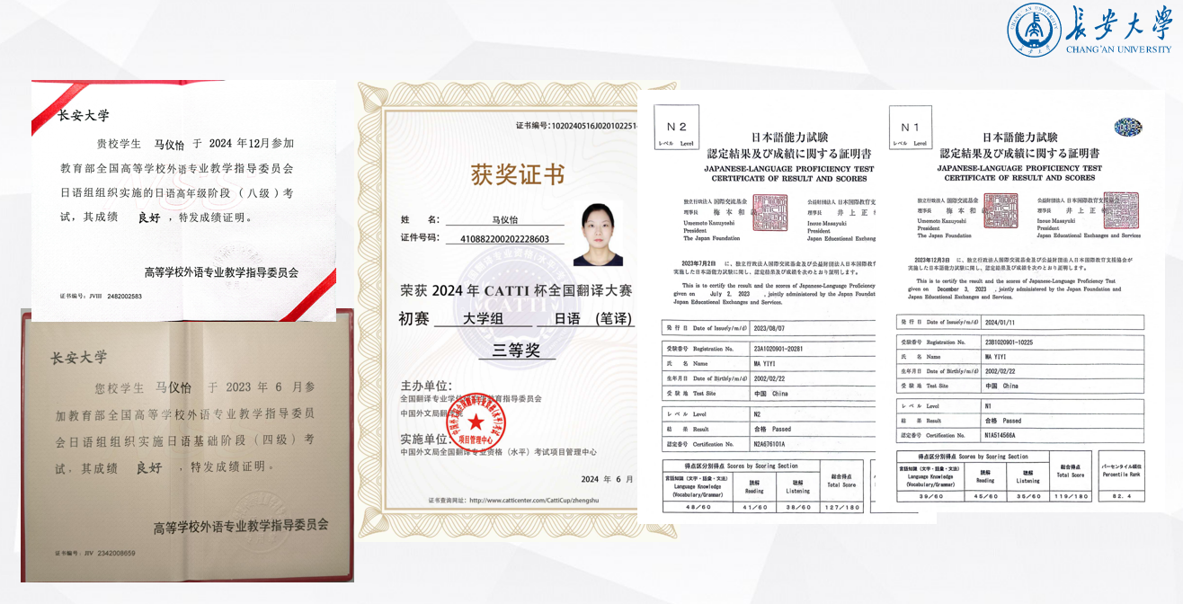 马仪怡,女,共青团员,太阳成tyc7111cc2021级日语专业本科生,现已保研至大连理工大学。加权成绩93.02,专业排名第一,获奖学金6项。取得了日语专、专八,日语能力测试一级、二级,大学英语四级,日语教师资格证等证书。获得第十九回中国人日语写作大赛“佳作奖”,2024“外研社·国才杯”“理解当代中国”全国大学生外语能力大赛省赛中获得陕西赛区日语组银奖,第十七届“中华杯”选拔大赛长安分赛区二等奖,2024年CATTI杯全国翻译大赛初赛大学组日语(笔译)三等奖,2024年第七届“亿学杯”全国大学生日语词汇及综合能力大赛省三等奖,第二届人民中国杯全国大学生日语词汇大赛本科生组优秀奖等学科竞赛奖。