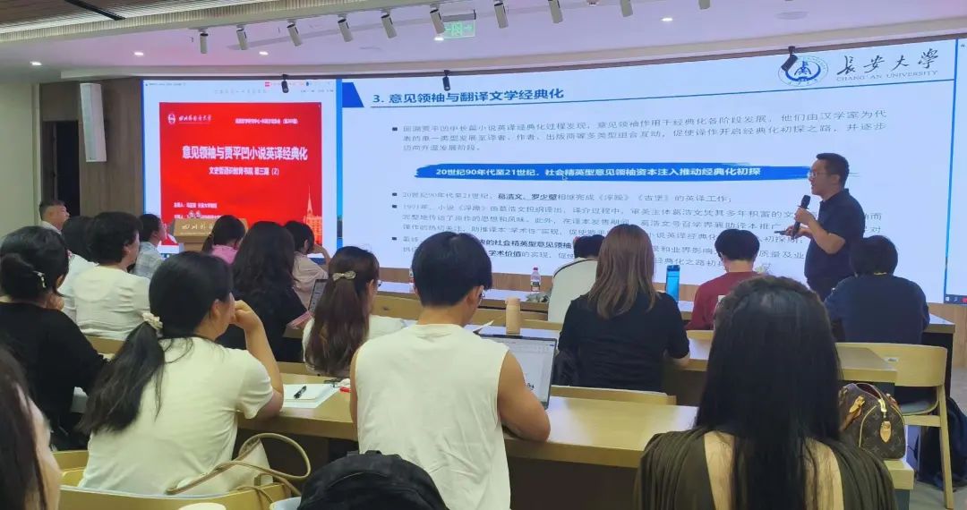 该讲座从以下两个主题展开:一是“师生互动中的知识共建与相互成就”;二是“贾平凹中长篇小说英译经典化”。在学术团队建设方面,冯正斌系统介绍了其创新性的跨校联合培养模式。由他带领的课题团队汇聚了来自4所高校的31名学生,通过建立“科研-教学-实践”一体化培养机制,构建了独具特色的学术共同体。经过系统培养,师生已合作发表CSSCI及核心期刊论文13篇,参与省部级项目20项,并有3名学生继续攻读博士学位,取得了显著的人才培养成效。在文学外译研究方面,冯正斌基于团队多年研究成果,深入剖析了贾平凹小说英译的经典化进程。研究系统梳理了贾平凹作品从20世纪90年代起步期、21世纪初停滞期到2016年后复兴期的完整传播脉络,揭示了从汉学家主导到多元主体协同的经典化动力演变机制。基于研究发现,冯正斌提出了缩短译介空窗期、培育复合型传播人才等具有实践指导意义的建议,为提升国内经典文学域外传播效能提供了参考镜鉴。