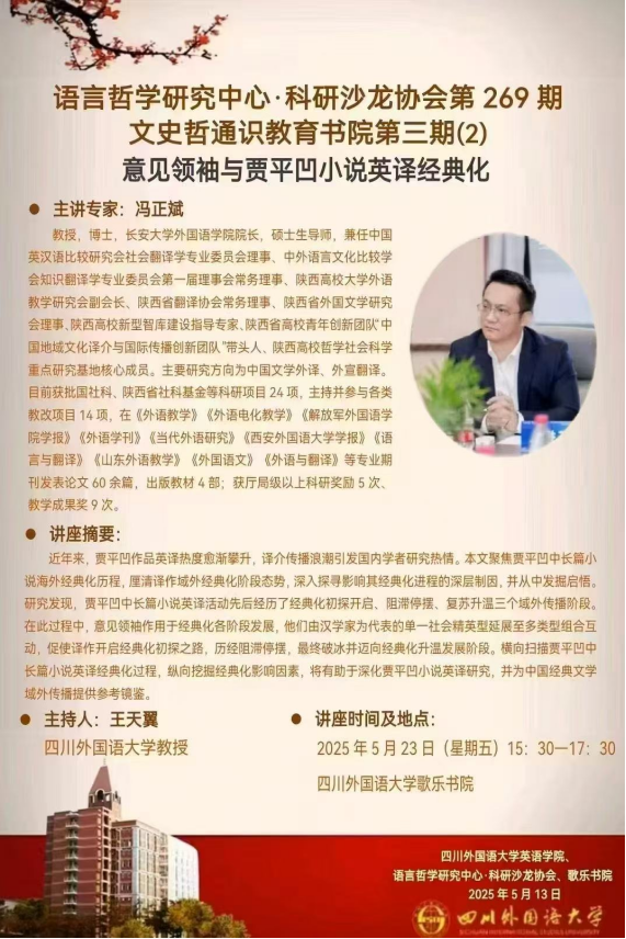 5月23日,我们院长冯正斌教授受四川外国语大学邀请,于该校歌乐书院作题为“意见领袖与贾平凹小说英译经典化”的学术讲座。本次讲座由四川外国语大学英语学院、语言哲学研究中心·科研沙龙协会及歌乐书院共同主办,王天翼教授主持,来自翻译学界的诸多师生及研究者参与了此次学术活动。