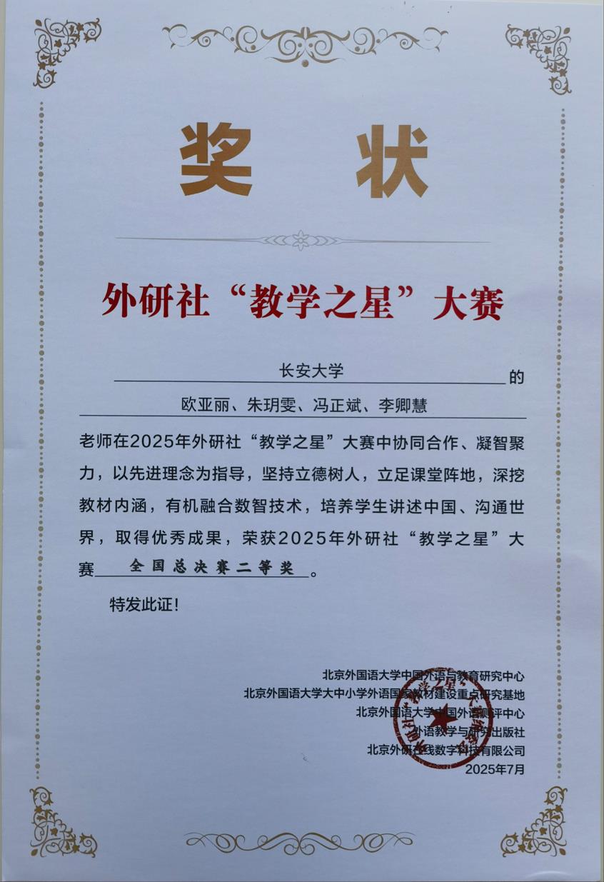 近日,2025年外研社“教学之星”大赛(FLTRP Star Teacher Contest)传来捷报,tyc7111cc太阳成集团欧亚丽教师团队表现突出,荣获全国总决赛二等奖。