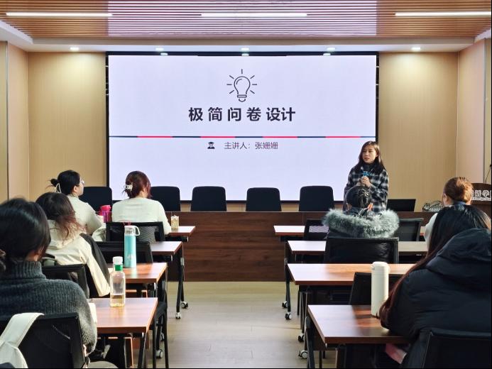 讲座中,张珊珊结合本次英语社会调查实践的特点,从六个方面系统地讲解了极简问卷设计的基本原则、结构、流程、方法、常见问题及其解决方法。她强调,一份科学的问卷不仅是数据收集的工具,更是跨文化沟通与学术严谨性的体现;并通过典型案例分析,生动演示了如何设计清晰、中立且符合英语表达习惯的调查问题,并分享了避免文化偏误、提高问卷信效度的实用技巧。