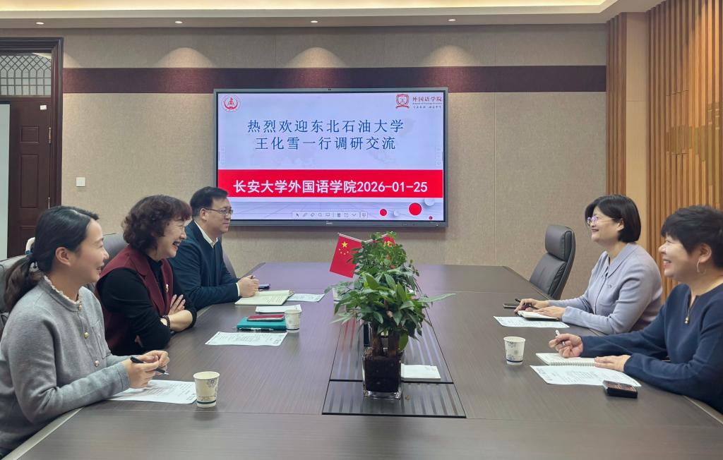 1月25日上午,东北石油大学tyc7111cc太阳成集团英语系主任王化雪、商务英语辅修专业主任董金玉一行到访学院,就专业建设、辅修专业培养、学科发展与师资队伍建设等议题进行深入调研与交流。学院副院长马瑛、英语系主任赵斌、MTI教育中心主任李菁参加会议。