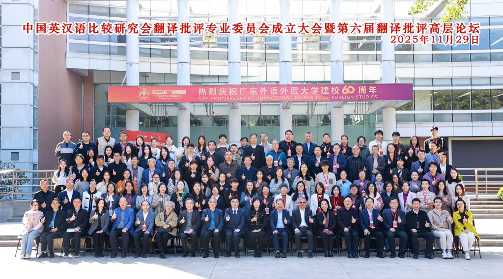 2025年11月28日至30日,中国英汉语比较研究会翻译批评专业委员会成立大会暨第六届翻译批评高层论坛在广州与韶关两地隆重举行。本次论坛由广东外语外贸大学承办,围绕“新时代翻译批评的理论建设、方法创新与实践路径”展开深入研讨,吸引了来自全国高校及研究机构的百余名专家学者。本次论坛设有多场主旨报告与平行分论坛,围绕文学与典籍译介、理论建构与译史研究、技术赋能与传播实践、质量评估与译者研究等主题展开深入交流,全面展现了翻译批评领域的前沿动态与研究纵深。