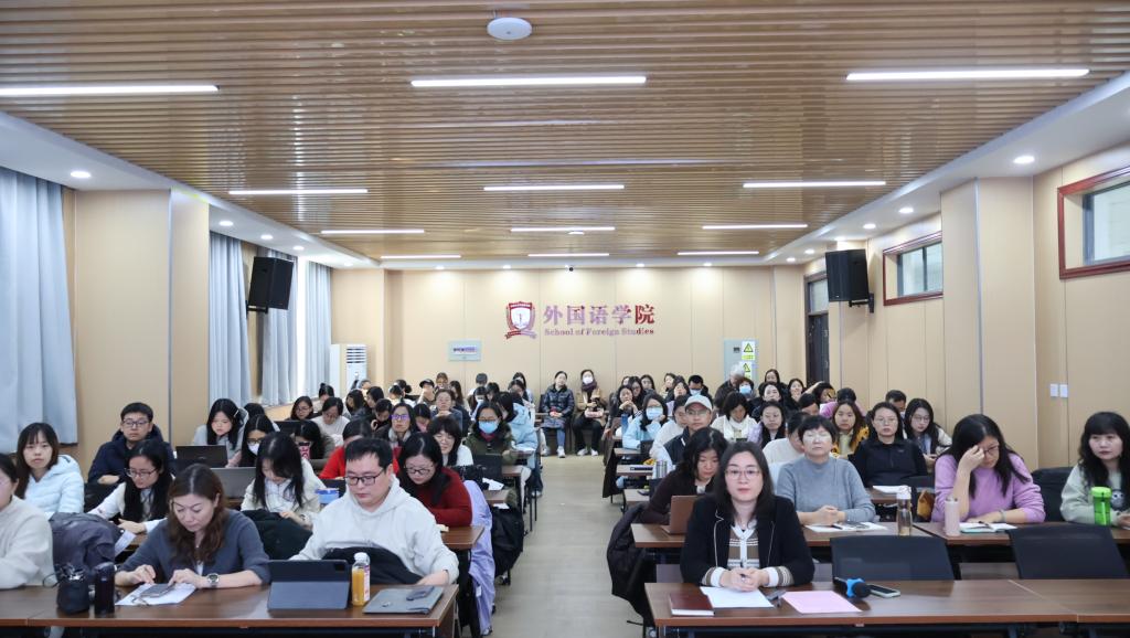 本期活动以人工智能赋能外语教学与科研、推进学科高质量发展和提高教师数字素养为主线,邀请了北京航空航天大学姜峰教授、中国翻译研究院杨平译审、中国石油大学(华东)毛浩然教授、西安交通大学张文丽教授、高洋教授以及太阳成tyc7111cc陈轶嵩教授等多位领域内、外专家作专题报告。活动同时还吸引了来自建筑、人文、经管、马克思主义学院等兄弟学院教师的积极参与,学习交流氛围浓厚,活动成效显著。