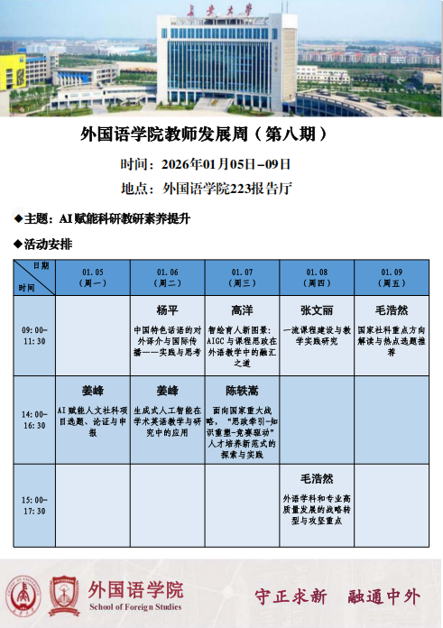 为深入贯彻落实全国教育大会精神和习近平总书记关于教师队伍建设的重要讲话精神,1月5日至9日,我们成功举办了第八期教师发展周暨AI赋能科研教研素养提升工作坊,累计423人次参加共计8场专题讲座和社科项目申报指导工作坊。